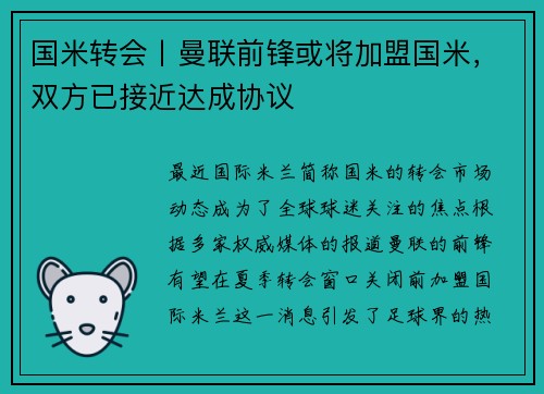 最近,国际米兰(简称“国米”)的转会市场动态成为了全球球迷关注的焦点。根据多家权威媒体的报道,曼联的前锋有望在夏季转会窗口关闭前加盟国际米兰,这一消息引发了足球界的热议。